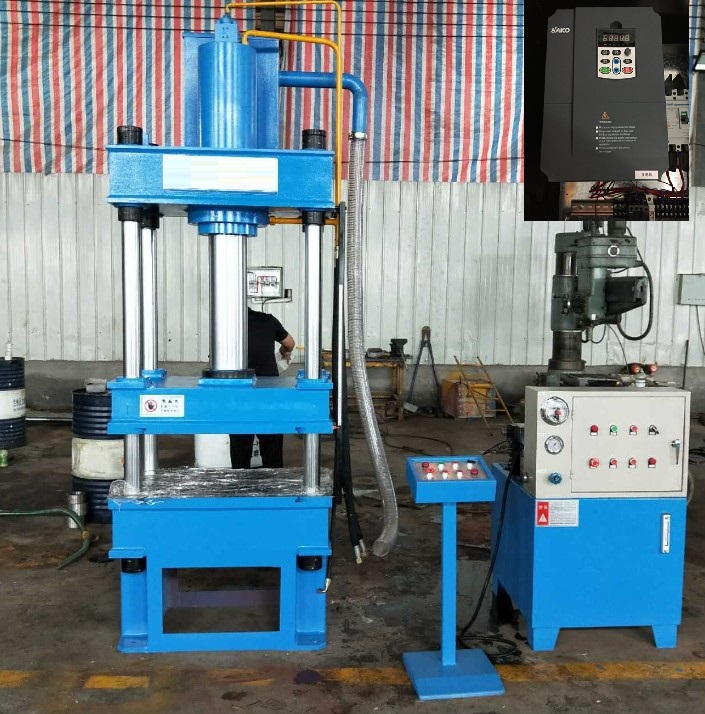 在沖壓設(shè)備行業(yè)中液壓沖床是一種能夠以全自動、智能化運(yùn)行的伺服電液復(fù)合壓力機(jī)??蛇m用于拉伸、彎曲、成型、沖裁落料、翻邊等各種沖壓工藝中,該設(shè)備所加工的產(chǎn)品可廣泛的應(yīng)用在汽車零部件、家用電器、廚房用具等諸多領(lǐng)域中。以下能夠是杭州三科所設(shè)計(jì)SKI600系列矢量重載變頻器在一種四柱式液壓沖床上的應(yīng)用方案。