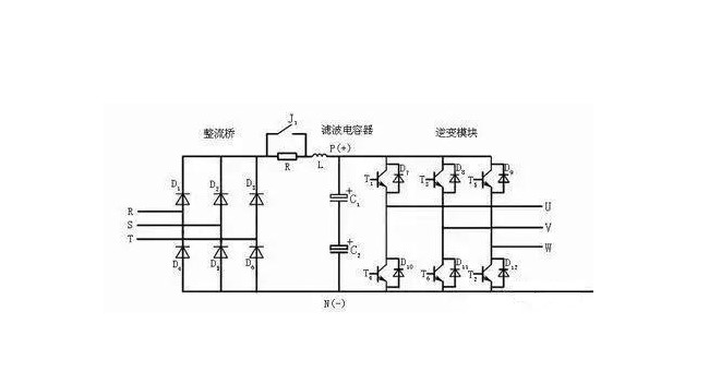 缺相故障是變頻器常見(jiàn)故障中的一種,要知道單相220V與三相380V是變頻器產(chǎn)品主要的分別,當(dāng)然輸入缺相檢測(cè)只存在于三相的產(chǎn)品中。圖1所示為變頻器主電路,R、S、T為三相交流輸入,當(dāng)其中的一相因?yàn)槿蹟嗥骰驍嗦菲鞯墓收隙鴶嚅_(kāi)時(shí),便認(rèn)為是發(fā)生了輸入缺相故障。