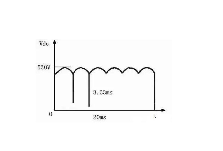 當(dāng)變頻器不發(fā)生缺相的正常情況下工作時(shí),Udc上的電壓如圖2所示,一個(gè)工頻周期內(nèi)將有6個(gè)波頭,此時(shí)直流電壓Udc將不會(huì)低于470V,實(shí)際上對(duì)于一個(gè)7.5kW的變頻器而言,其C的值大小一般為900uf,當(dāng)滿載運(yùn)行時(shí),可以計(jì)算出周期性的電壓降落大致為40V,紋波系數(shù)不會(huì)超過(guò)7.5%。而當(dāng)輸入缺相發(fā)生時(shí),一個(gè)工頻周期中只有2個(gè)電壓波頭,且整流電壓最低值為零。此時(shí)在上述條件下,可以估算出電壓降落大致為150V,紋波系數(shù)要達(dá)到30%左右。